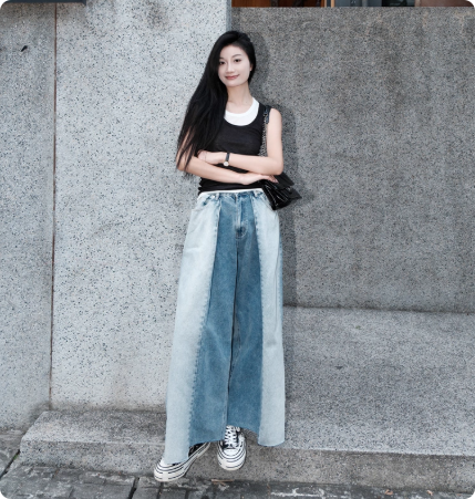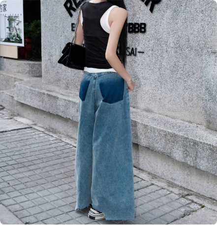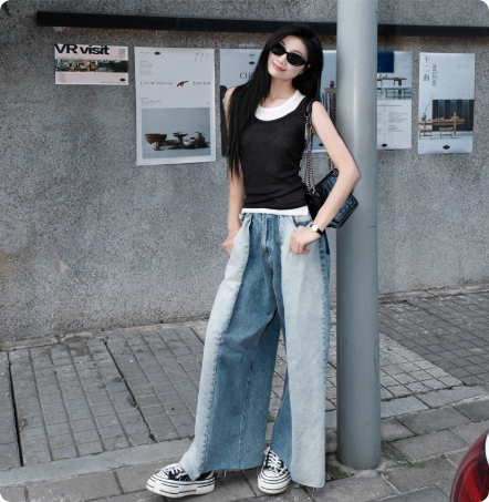 女士解构设计拼接牛仔直筒裤
