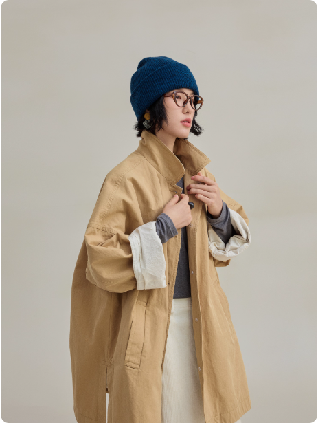 新品100%棉细斜纹休闲文艺双层廓形感风衣外套