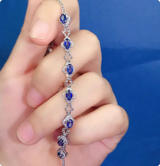 蓝宝石手链18K金镶嵌皇家蓝白金色四叶草钻石围镶款斯里兰卡手饰