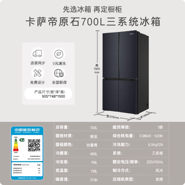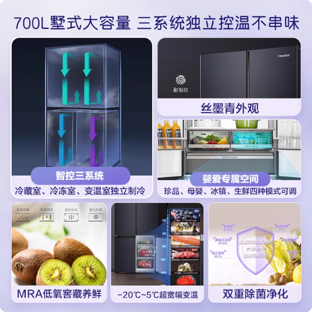 700L四门大容量风冷无霜一级家用三系统电冰箱